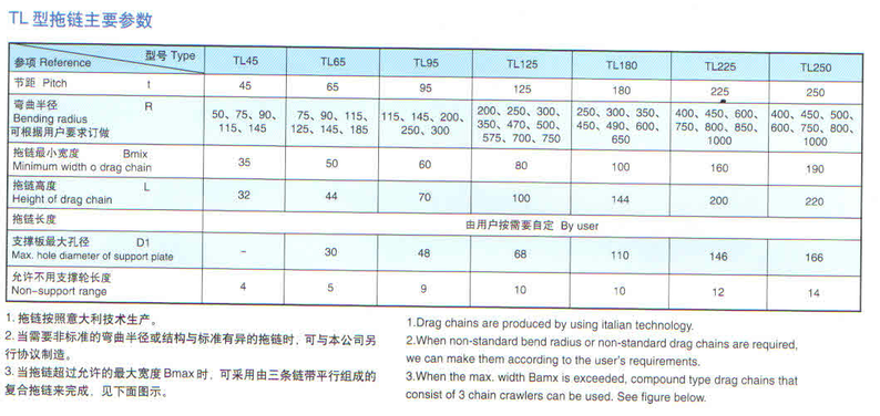 TL系列拖鏈的主體是由鏈板(優(yōu)質鋼板鍍鉻)支撐板(擠拉鋁合金)軸銷(合金鋼)等部件組成,使電纜或橡膠管與拖鏈之間不產生相對運動,不產生扭曲變形,鏈板經(jīng)鍍鉻處理外形效果新穎,結構合理,靈巧強度高,鋼性好不變形,安裝方便,使用可靠,易拆裝,尤其是本產品采用了高強度耐磨材料,合金為軸銷,提高了產品的耐磨強度,彎曲更靈活,阻力更小,降低了噪音,從而可保證長時間不變形,不下垂。 |