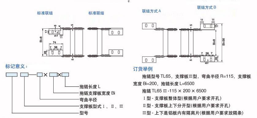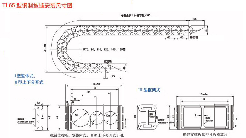 TL65系列拖鏈的主體是由鏈板(優(yōu)質(zhì)鋼板鍍鉻)支撐板(擠拉鋁合金)軸銷(合金鋼)等部件組成,使電纜或橡膠管與拖鏈之間不產(chǎn)生相對運動,不產(chǎn)生扭曲變形,鏈板經(jīng)鍍鉻處理外形效果新穎,結(jié)構(gòu)合理,靈巧強度高,鋼性好不變形,安裝方便,使用可靠,易拆裝,尤其是本產(chǎn)品采用了高強度耐磨材料,合金為軸銷,提高了產(chǎn)品的耐磨強度,彎曲更靈活,阻力更小,降低了噪音,從而可保證長時間不變形,不下垂。 |