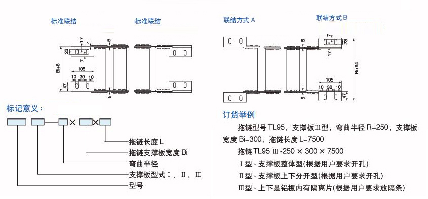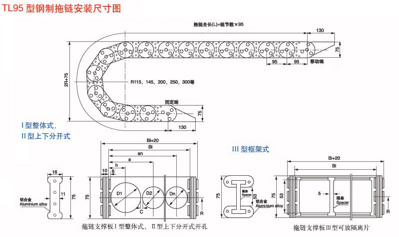 TL95系列拖鏈的主體是由鏈板(優(yōu)質(zhì)鋼板鍍鉻)支撐板(擠拉鋁合金)軸銷(合金鋼)等部件組成,使電纜或橡膠管與拖鏈之間不產(chǎn)生相對運動,不產(chǎn)生扭曲變形,鏈板經(jīng)鍍鉻處理外形效果新穎,結(jié)構(gòu)合理,靈巧強度高,鋼性好不變形,安裝方便,使用可靠,易拆裝,尤其是本產(chǎn)品采用了高強度耐磨材料,合金為軸銷,提高了產(chǎn)品的耐磨強度,彎曲更靈活,阻力更小,降低了噪音,從而可保證長時間不變形,不下垂。 |