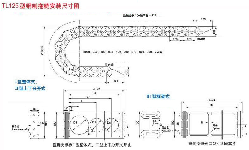 TL125系列拖鏈的主體是由鏈板(優(yōu)質(zhì)鋼板鍍鉻)支撐板(擠拉鋁合金)軸銷(xiāo)(合金鋼)等部件組成,使電纜或橡膠管與拖鏈之間不產(chǎn)生相對(duì)運(yùn)動(dòng),不產(chǎn)生扭曲變形,鏈板經(jīng)鍍鉻處理外形效果新穎,結(jié)構(gòu)合理,靈巧強(qiáng)度高,鋼性好不變形,安裝方便,使用可靠,易拆裝,尤其是本產(chǎn)品采用了高強(qiáng)度耐磨材料,合金為軸銷(xiāo),提高了產(chǎn)品的耐磨強(qiáng)度,彎曲更靈活,阻力更小,降低了噪音,從而可保證長(zhǎng)時(shí)間不變形,不下垂。 |