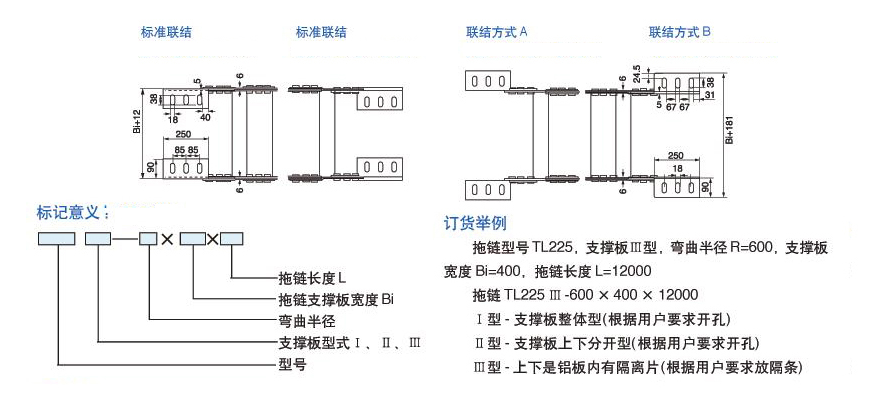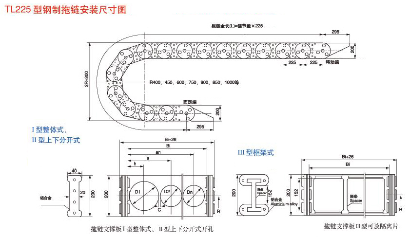 TL系列拖鏈的主體是由鏈板(優(yōu)質(zhì)鋼板鍍鉻)支撐板(擠拉鋁合金)軸銷(合金鋼)等部件組成,使電纜或橡膠管與拖鏈之間不產(chǎn)生相對運動,不產(chǎn)生扭曲變形,鏈板經(jīng)鍍鉻處理外形效果新穎,結(jié)構(gòu)合理,靈巧強度高,鋼性好不變形,安裝方便,使用可靠,易拆裝,尤其是本產(chǎn)品采用了高強度耐磨材料,合金為軸銷,提高了產(chǎn)品的耐磨強度,彎曲更靈活,阻力更小,降低了噪音,從而可保證長時間不變形,不下垂。 |