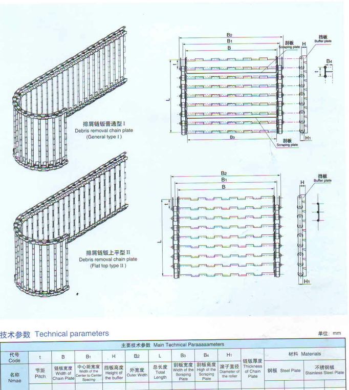 鏈板排屑機(jī)型號(hào)及特性: |