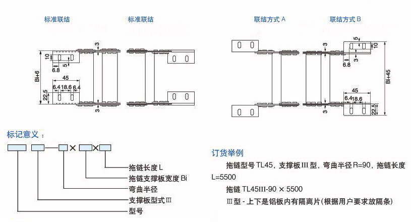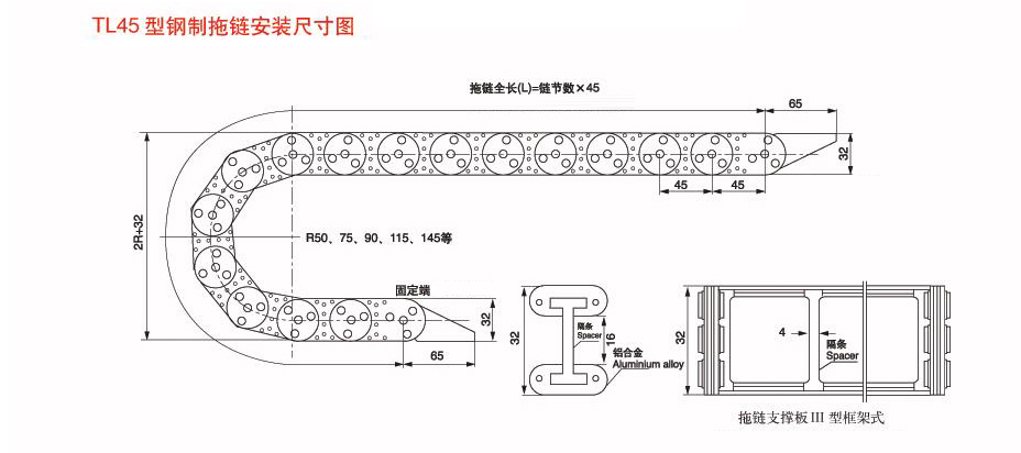 TL系列拖鏈的主體是由鏈板(優(yōu)質(zhì)鋼板鍍鉻)支撐板(擠拉鋁合金)軸銷(合金鋼)等部件組成,使電纜或橡膠管與拖鏈之間不產(chǎn)生相對(duì)運(yùn)動(dòng),不產(chǎn)生扭曲變形,鏈板經(jīng)鍍鉻處理外形效果新穎,結(jié)構(gòu)合理,靈巧強(qiáng)度高,鋼性好不變形,安裝方便,使用可靠,易拆裝,尤其是本產(chǎn)品采用了高強(qiáng)度耐磨材料,合金為軸銷,提高了產(chǎn)品的耐磨強(qiáng)度,彎曲更靈活,阻力更小,降低了噪音,從而可保證長(zhǎng)時(shí)間不變形,不下垂。 |